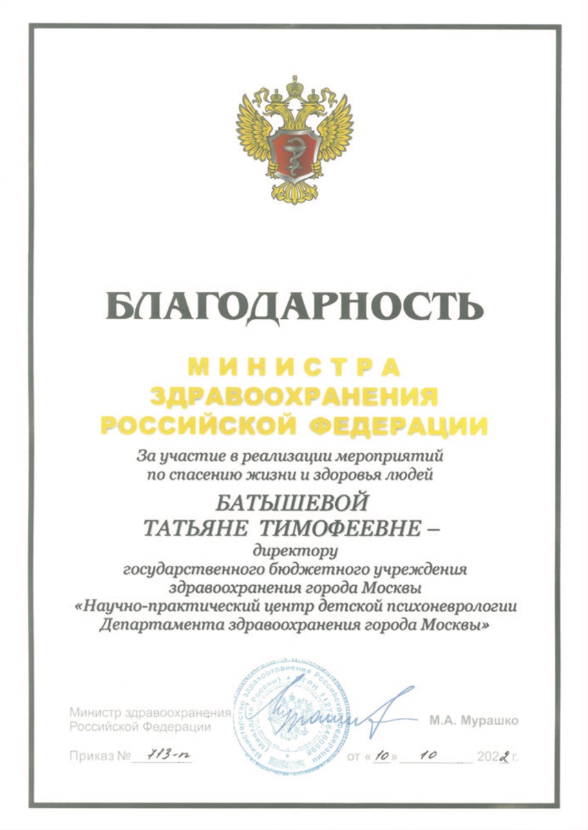 Татьяна Тимофеевна Батышева, директор Научно практического центра детской психоневрологии ДЗМ. Главный внештатный детский специалист невролог ДЗМ, Главный внештатный детский специалист по медицинской реабилитации МЗ РФ, Заведующий кафедрой неврологии, физической, реабилитационной медицины и психологии детского возраста ФНМО МИ РУДН, Заслуженный врач РФ, Доктор медицинских наук, Профессор.